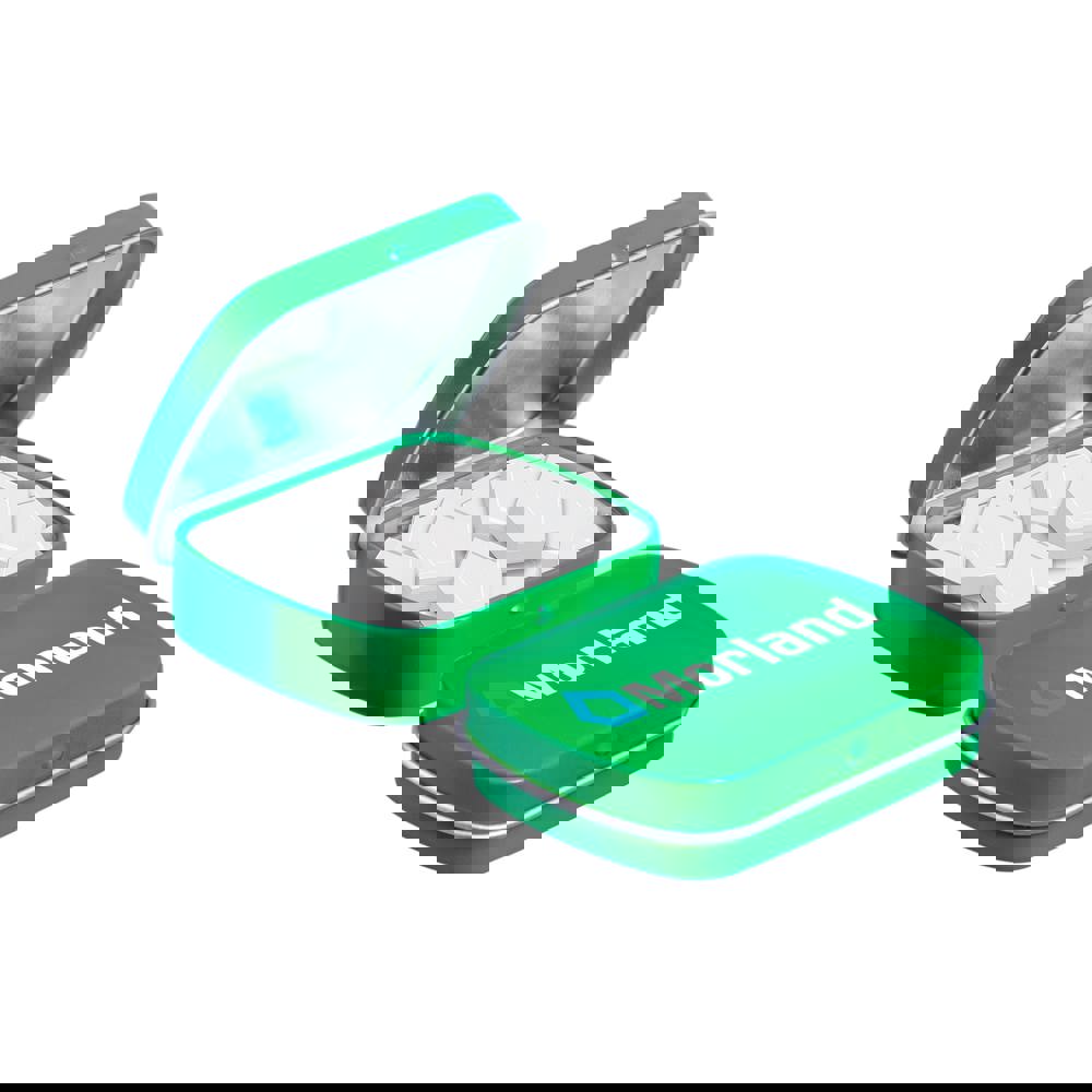 Mini hinged tin green filled with approx. 23 gram logo mints, including ingredients sticker and seal