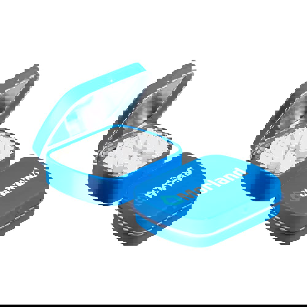 Mini hinged tin cobalt blue filled with approx. 23 gram logo mints, including ingredients sticker and seal
