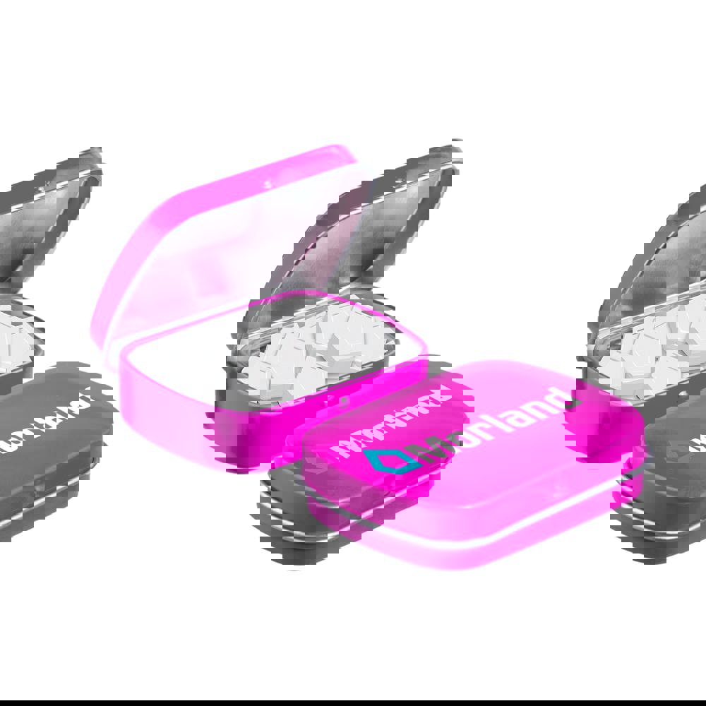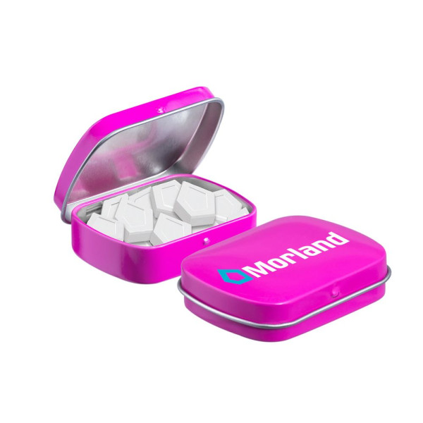 Mini hinged tin pink filled with approx. 23 gram logo mints, including ingredients sticker and seal