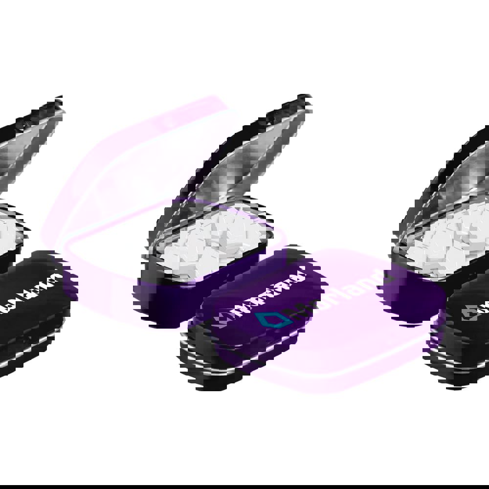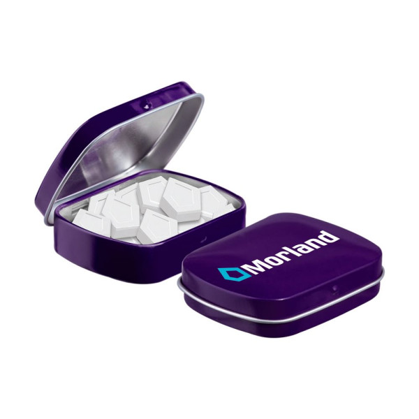 Mini hinged tin purple filled with approx. 23 gram logo mints, including ingredients sticker and seal