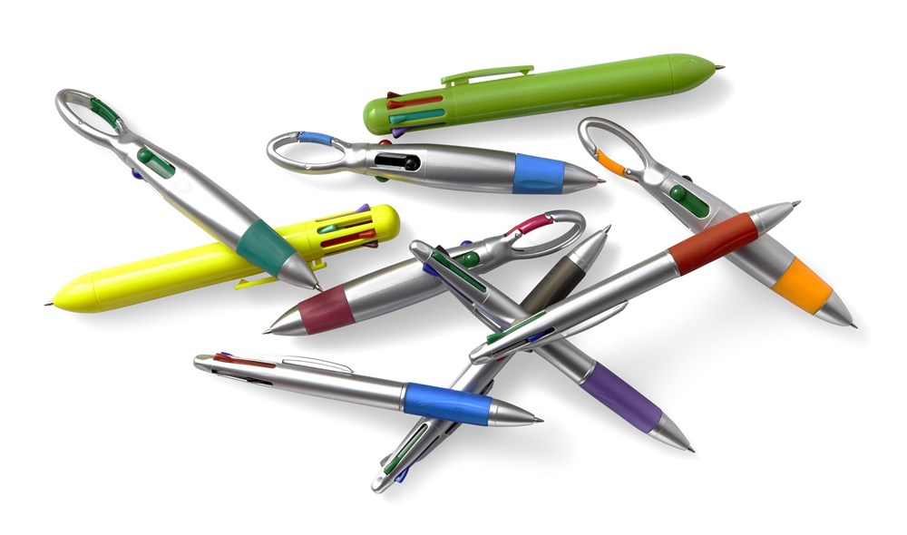 Stylo bille mousqueton en plastique avec embase en gomme muni de 4 mines rouge, verte, bleue et noire.
