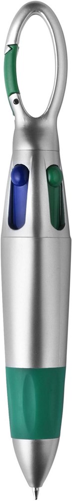 Stylo bille mousqueton en plastique avec embase en gomme muni de 4 mines rouge, verte, bleue et noire.