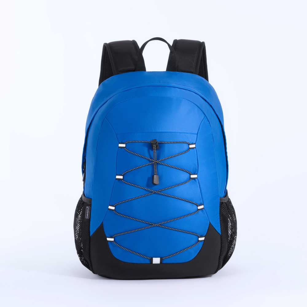 A functional sporty backpack in a vibrant color with contrasting black panels on the bottom and sides. The front features an elastic bungee cord system for attaching additional gear. • Elastic bungee cords on the front allow quick attachment of lightweight items, such as a jacket or mat. • A reflective system integrated into the front of the backpack, ensuring the user's visibility at night. • Side mesh pockets are perfect for water bottles or other small accessories. • Ergonomic, ventilated back panel ensures breathability and comfort during use. • Padded shoulder straps ensure comfortable carrying. • A spacious main compartment with a zipper allows for storing various items, from documents to sports equipment. • Includes a dedicated laptop compartment, providing secure storage for laptops during travel or daily commutes. • Lightweight yet durable material, resistant to daily wear and moderate weather conditions. • Ideal for everyday use, hiking trips, school, or gym activities. • Capacity: 22L