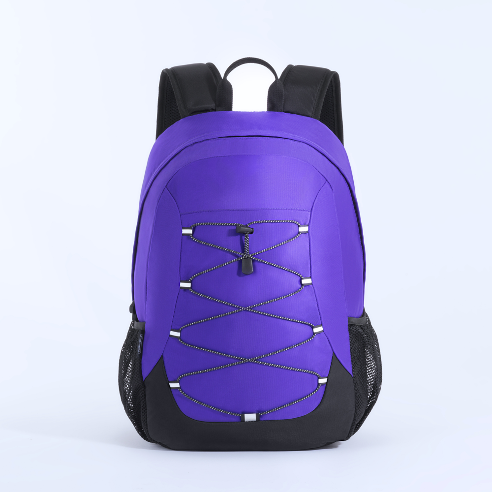 A functional sporty backpack in a vibrant color with contrasting black panels on the bottom and sides. The front features an elastic bungee cord system for attaching additional gear. • Elastic bungee cords on the front allow quick attachment of lightweight items, such as a jacket or mat. • A reflective system integrated into the front of the backpack, ensuring the user's visibility at night. • Side mesh pockets are perfect for water bottles or other small accessories. • Ergonomic, ventilated back panel ensures breathability and comfort during use. • Padded shoulder straps ensure comfortable carrying. • A spacious main compartment with a zipper allows for storing various items, from documents to sports equipment. • Includes a dedicated laptop compartment, providing secure storage for laptops during travel or daily commutes. • Lightweight yet durable material, resistant to daily wear and moderate weather conditions. • Ideal for everyday use, hiking trips, school, or gym activities. • Capacity: 22L