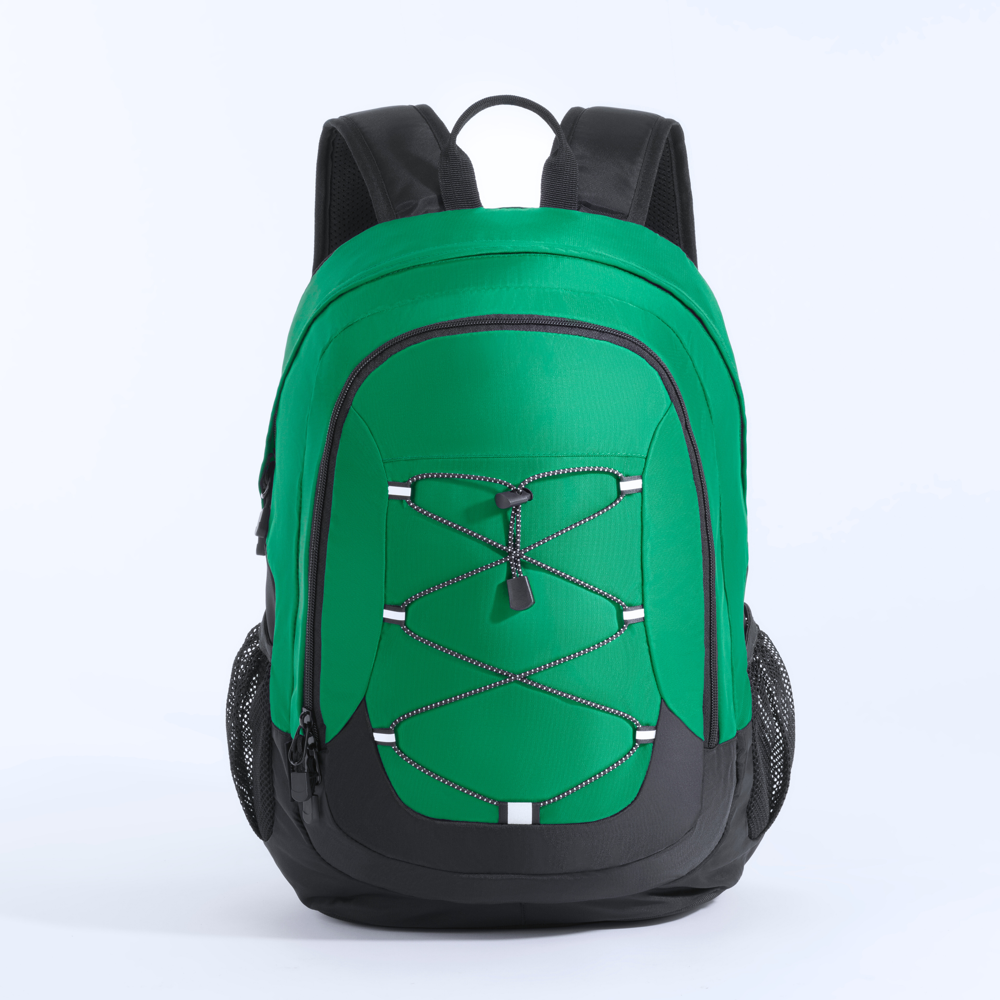 A functional sporty two-compartment backpack in a vibrant color with contrasting black panels on the bottom and sides. The front features an elastic bungee cord system for attaching additional gear. • Elastic bungee cords on the front allow quick attachment of lightweight items, such as a jacket or mat. • A reflective system integrated into the front of the backpack, ensuring the user's visibility at night. • Side mesh pockets are perfect for water bottles or other small accessories. • Ergonomic, ventilated back panel ensures breathability and comfort during use. • Padded shoulder straps ensure comfortable carrying. • A spacious main compartment with a zipper allows for storing various items, from documents to sports equipment. • Includes a dedicated laptop compartment, providing secure storage for laptops during travel or daily commutes. • Lightweight yet durable material, resistant to daily wear and moderate weather conditions. • Ideal for everyday use, hiking trips, school, or gym activities. • Capacity: 25L
