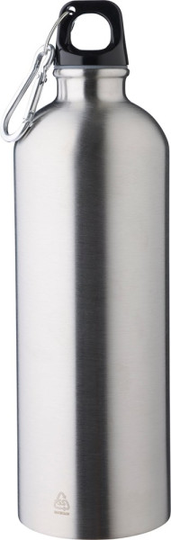 Gourde simple paroi en acier inoxydable recyclé (s/s304) d’une capacité de 750 ml, couvercle en PP et mousqueton en aluminium argenté.