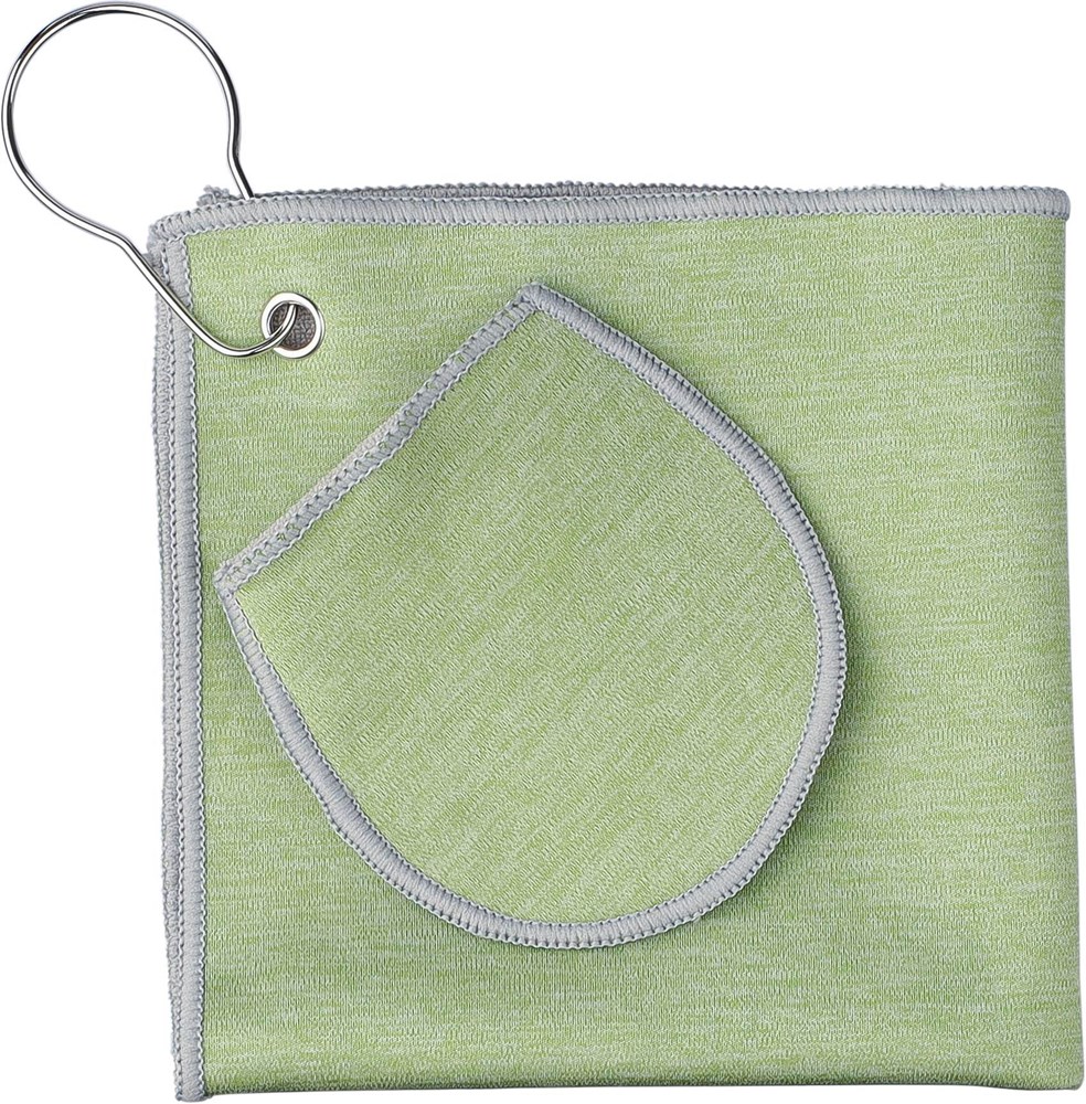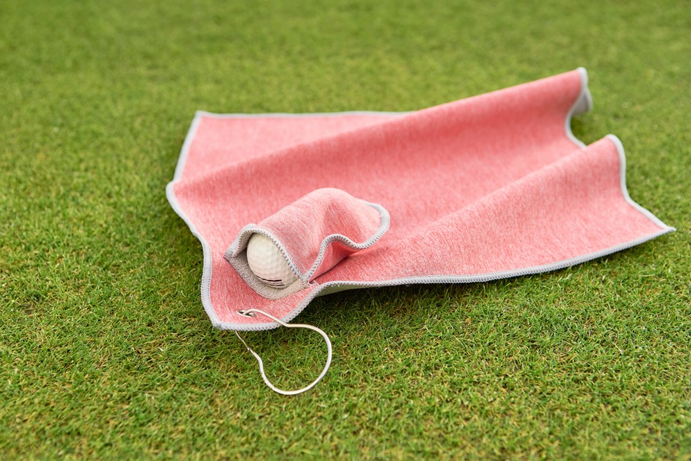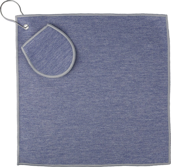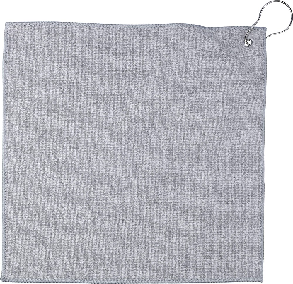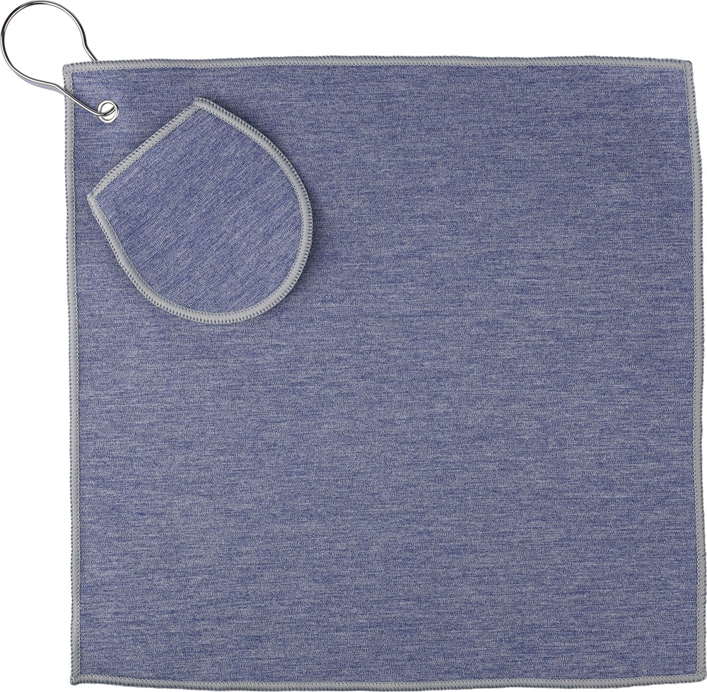 Serviette de golf en rPET avec pochette pour balles de golf intégrée, d’une dimension de 31 x 31 cm avec crochet en métal.