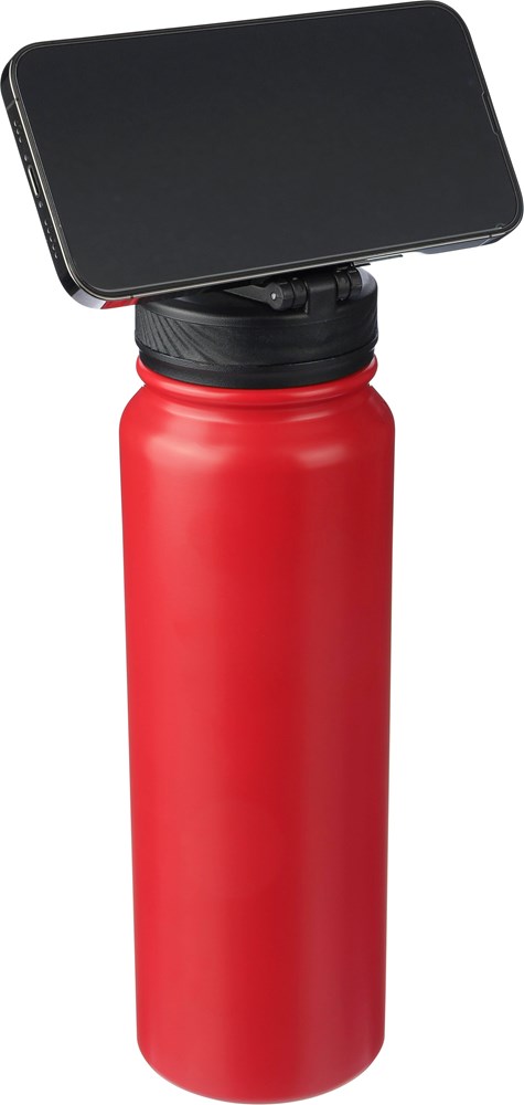 Gourde isotherme double paroi en acier inoxydable d’une contenance de 800 ml, intérieur est en acier inoxydable 304 et extérieur est en acier inoxydable 201 avec bouchon en PP muni d’une poignée servant également de support de téléphone, dans une boîte cadeau en kraft.