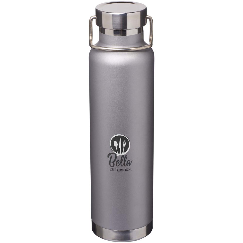 Bouteille en acier inoxydable recyclé à double paroi, certifiée RCS, avec isolation sous vide en cuivre qui conserve les boissons chaudes pendant 12 heures ou froides pendant 48 heures. Comprend un couvercle à vis en acier inoxydable recyclé et une poignée en acier inoxydable durable. Large ouverture pour un remplissage et un service confortable. Capacité : 650 ml. Présentée dans une boîte cadeau.
