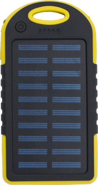 Batterie externe solaire en ABS toucher gomme avec voyants verts et lampe de poche latérale. Deux ports USB et un port USB-C. Charge solaire 5 V/200 mA. Entrée DC 5 V/1 A. Sortie DC 5 V/2 x 1 A. Capacité : 4 000 mAh. Câble USB inclus.