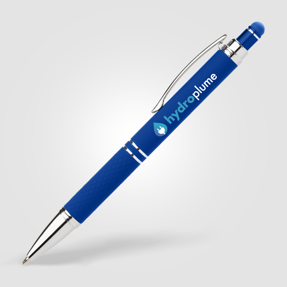 The Phoenix Softy Brights features our popular soft-touch rubberized finish in vibrant bright colours, which also coat the diamond-texture grip. This modern, metal click-action pen has a slightly wider barrel than the traditional ballpoint pen. Polished chrome accents, trim and clip create a sophisticated look. Choose from a variety of leading barrel and matching stylus colours. Customize with silver laser engraving or a full-colour imprint (colourJet technology).