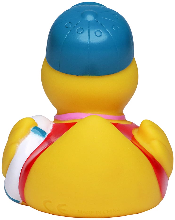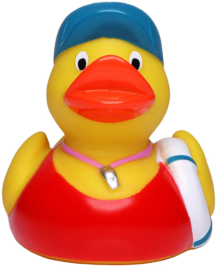 Is your bathtub safe? Certainly not safe enough without this pool attendant duck! Dressed in a red swimsuit, a blue cap and the typical whistle around the neck of the pool attendant, this duck makes sure that everyone abides by the rules: under no circumstances is it possible to jump from the edge of the pool into its tub, and thanks to the blue and white swimming ring, this lifeguard is also able to rescue someone in an emergency.