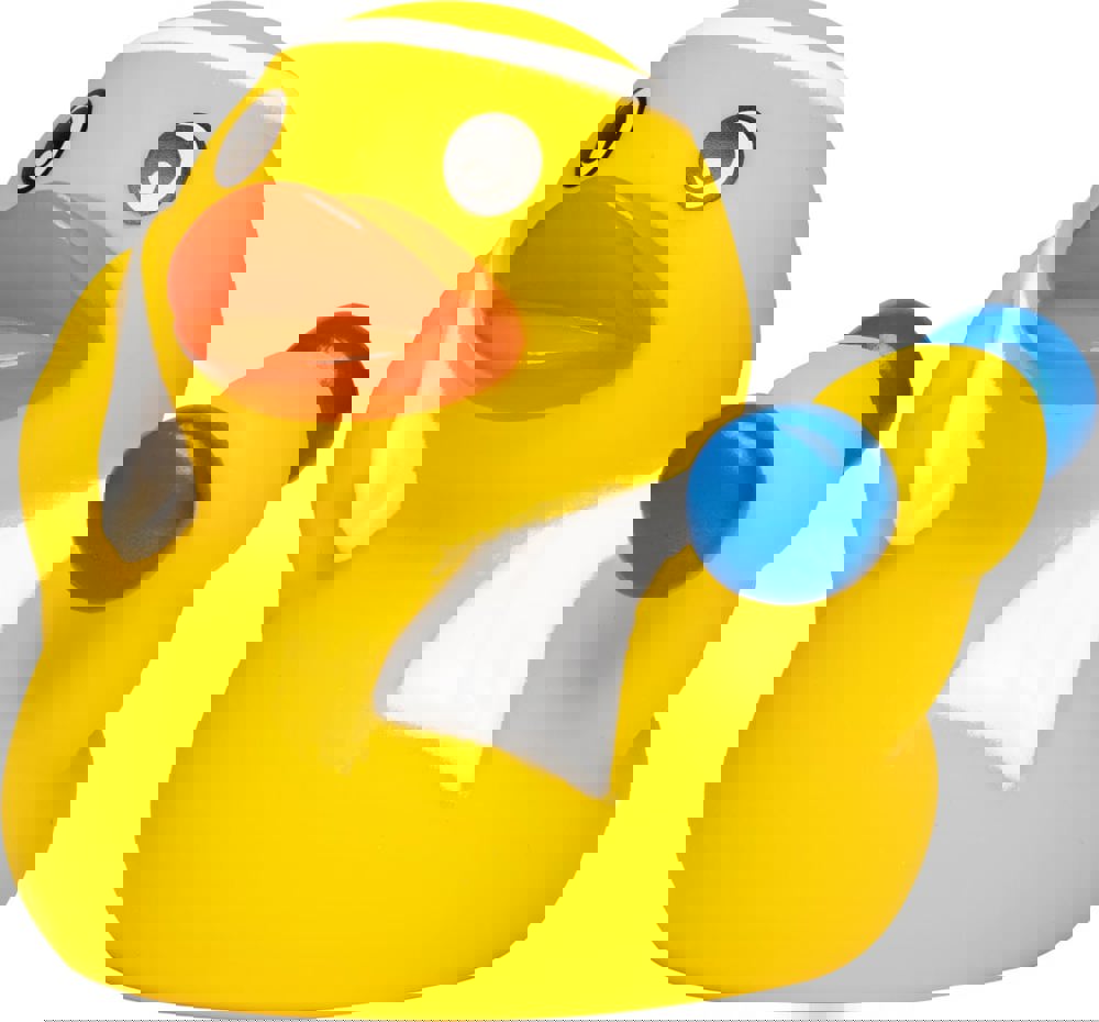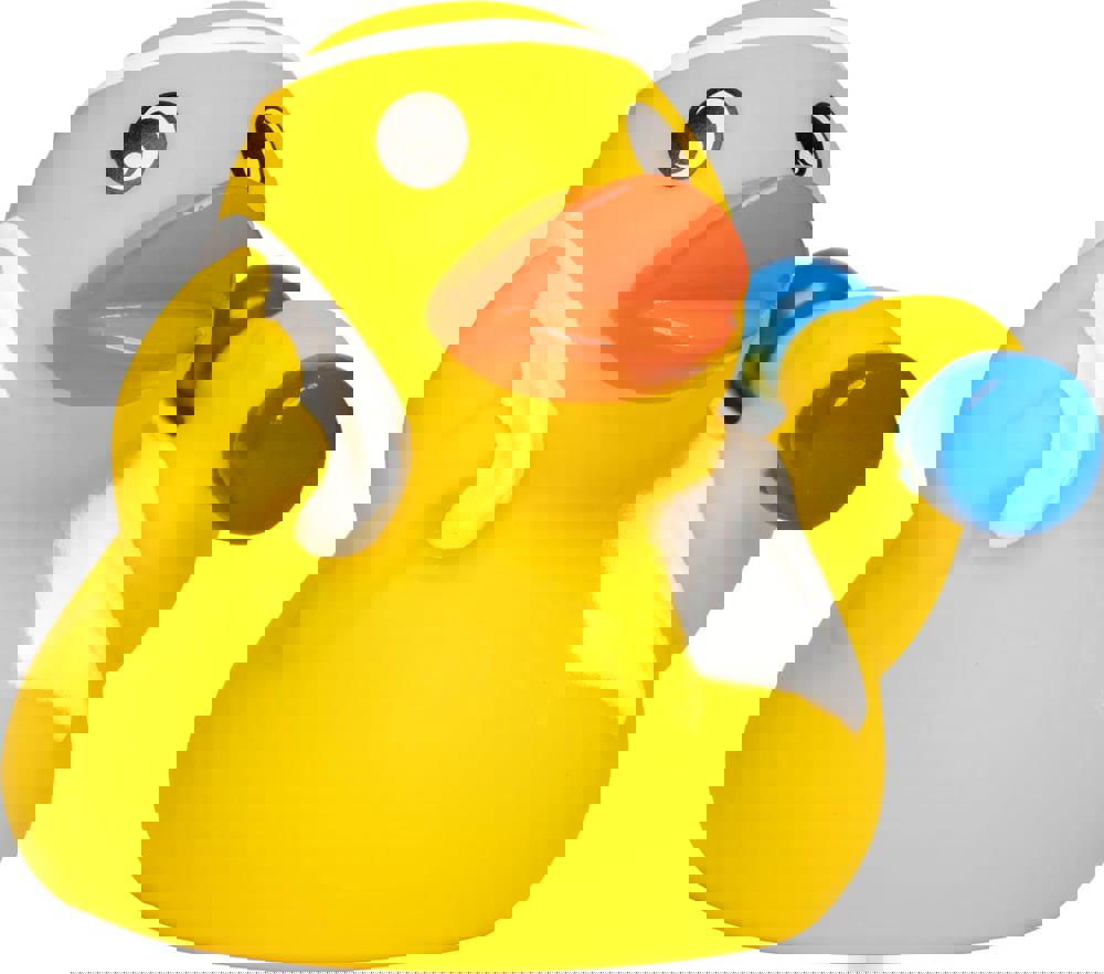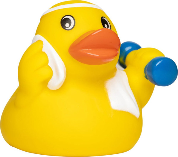 Relaxed in the bathtub, this duck is only bored. She is designed for maximum physical performance. The sweatband on her head and the towel around her neck ensure that she achieves top performance and not only with the dumbbell she brought along! This sports cannon is perfect as a personal trainer in your bathtub and makes sure that you stay athletic and fit!