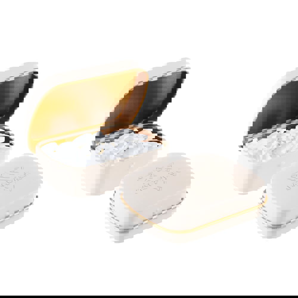 Mini hinge tin frosted sand with gold interior and approx. 23 grams of peppermint. And featuring embossing. Includes ingredient sticker and seal.