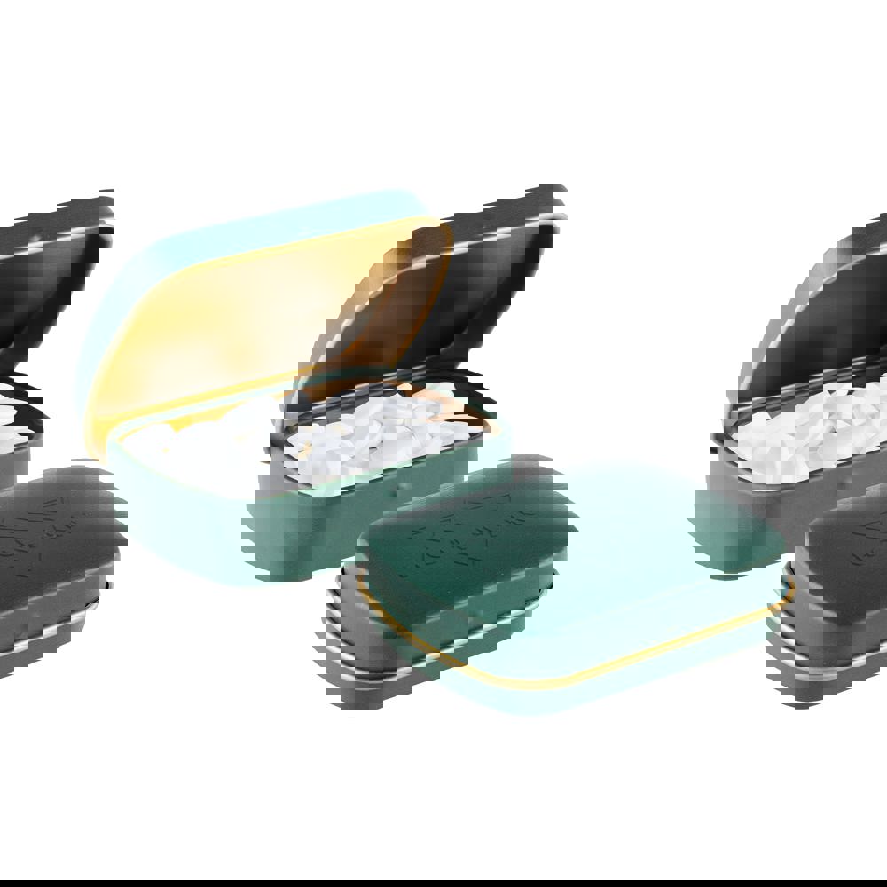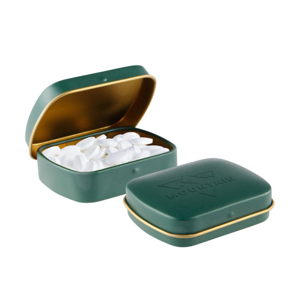 Mini hinge tin frosted green with gold interior and approx. 23 grams of peppermint. And featuring embossing. Includes ingredient sticker and seal.