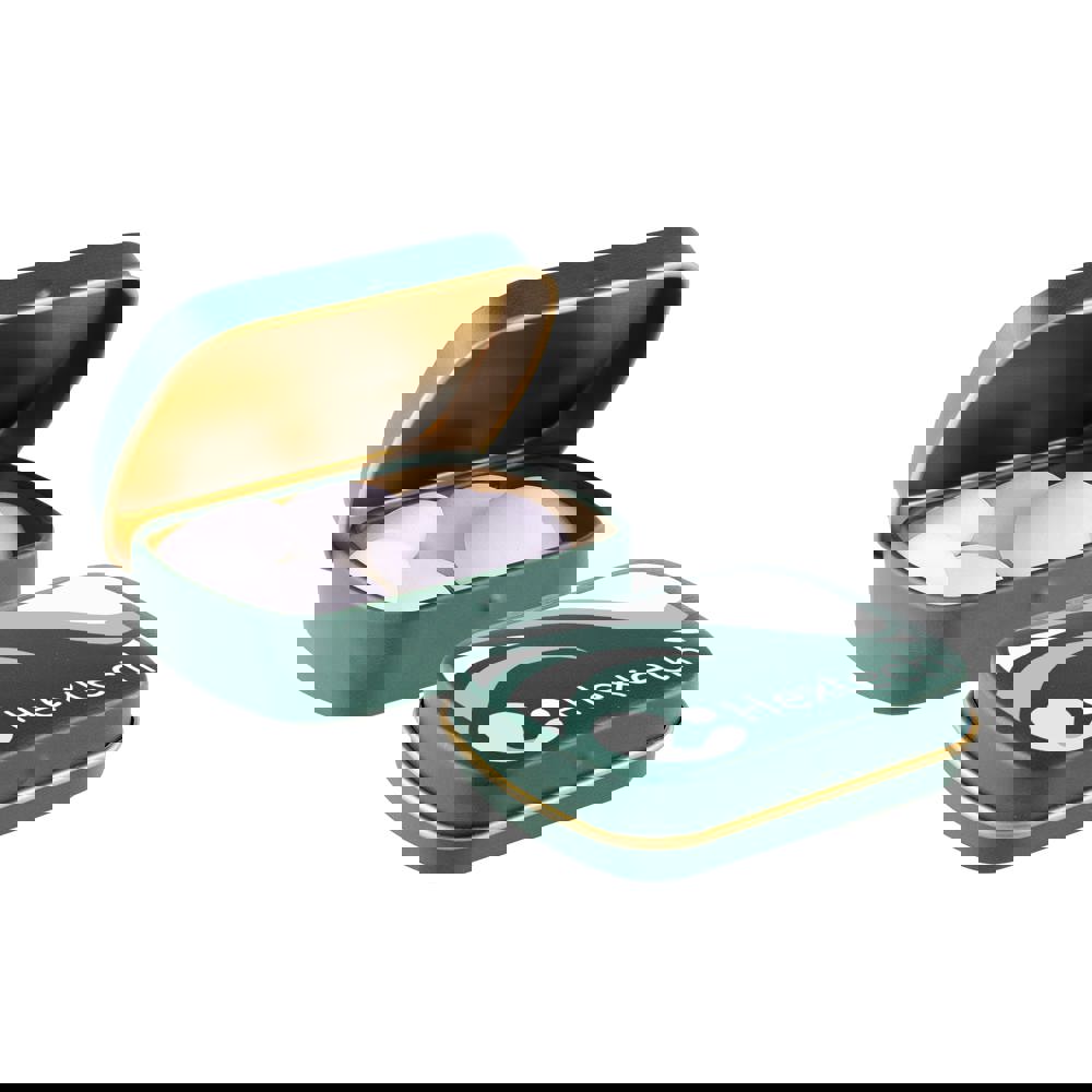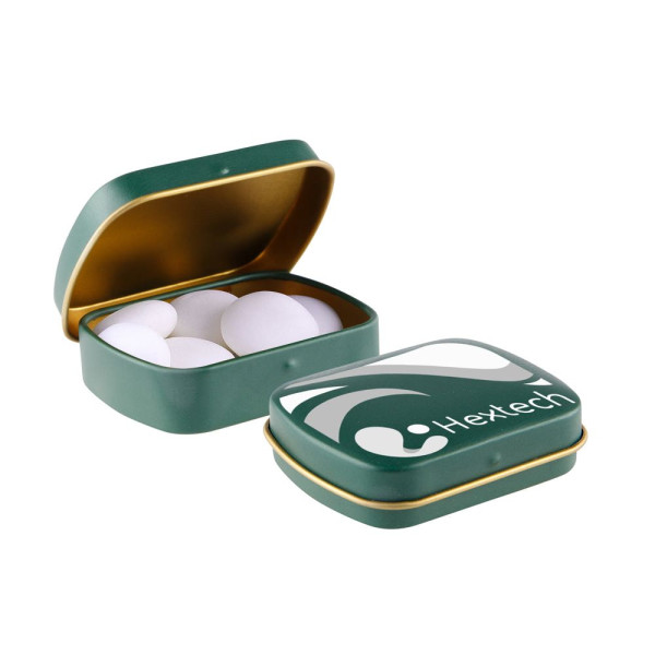 Mini hinge tin frosted green with gold interior and approx. 28 grams of Mentos mints. Features full color printing and includes ingredient sticker and seal.