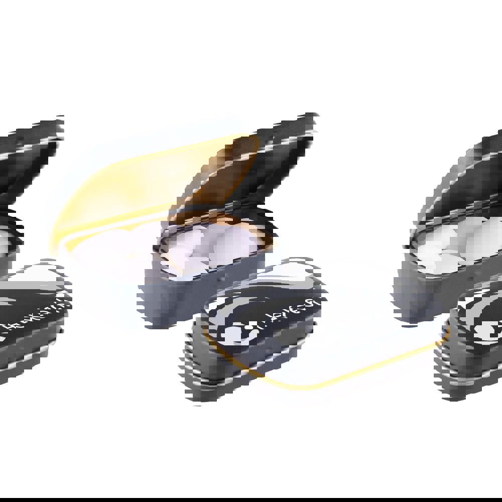 Mini hinge tin frosted dark blue with gold interior and approx. 28 grams of Mentos mints. Features full color printing and includes ingredient sticker and seal.
