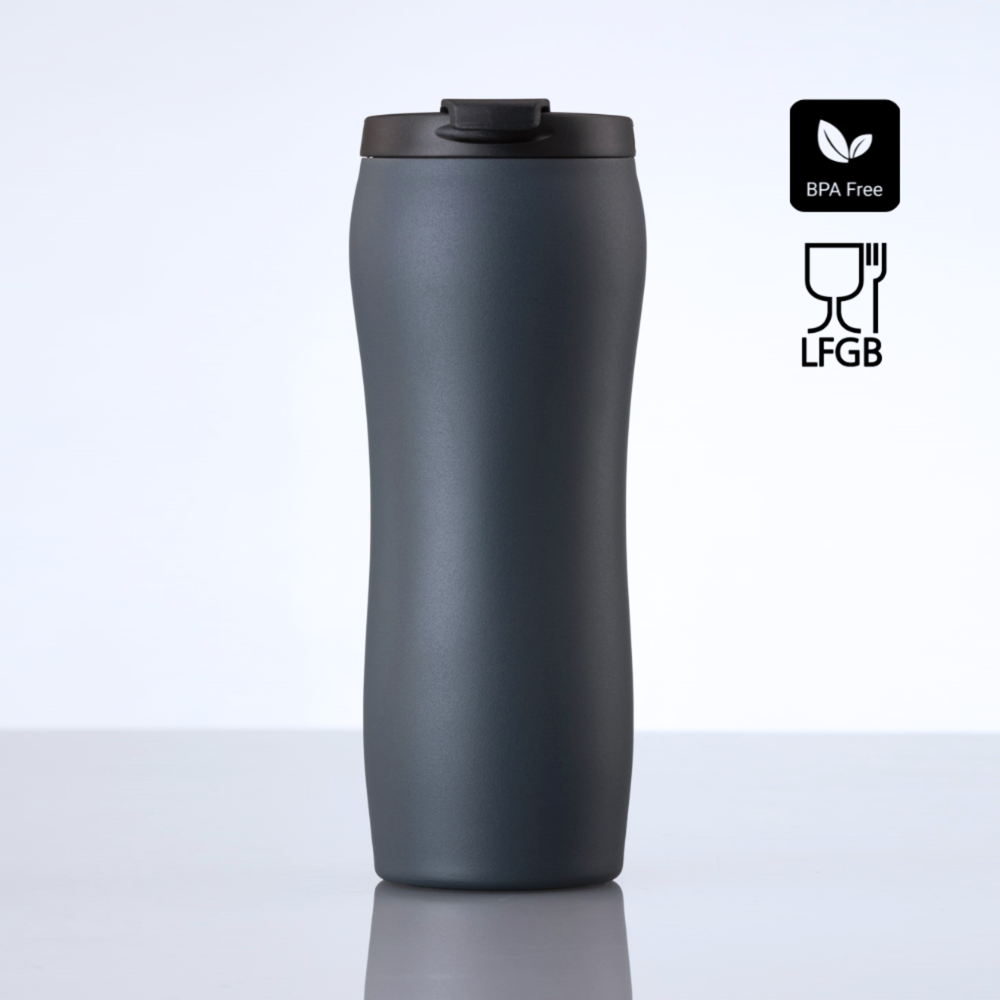 Leakproof thermal mug made of high-quality stainless steel, finished with a matte powder coating which provides not only durability but also great looks. Double walls perfectly retain the desired temperature for up to 6 hours. The click closure design will keep your drink hot and safe. The product is certified for food contact and is BPA-free. Capacity: 400 ml.