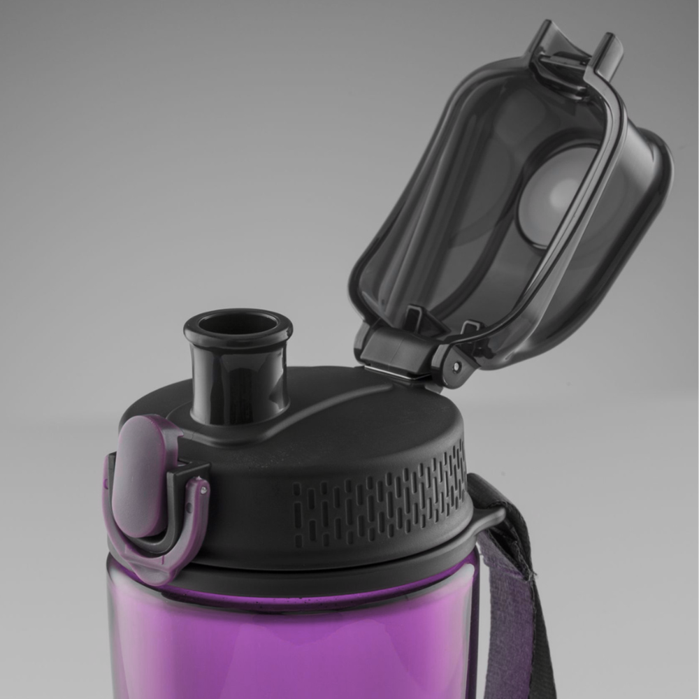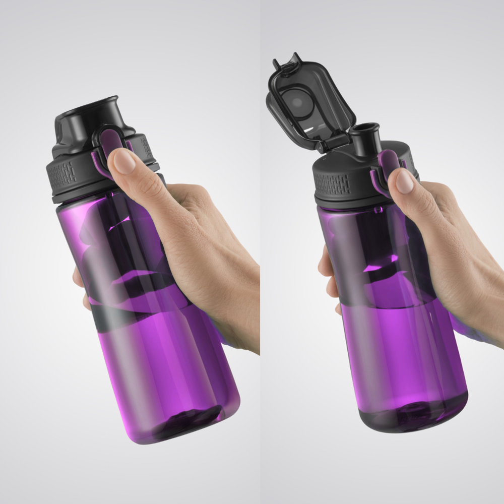 Neon water bottle is a stylish and functional solution for those on the go. The bottle is made of durable Tritan material, resistant to damage, and the leakproof cap is constructed from a combination of plastic and ABS, ensuring longevity. The innovative design includes a convenient one-click opening mechanism for quick and easy access to your beverage. When not using the bottle, you can lock the cap to prevent the contents from spilling. The wide opening allows you to put ice cubes inside. The bottle is also equipped with a material handle for convenience. The product is certified for food contact and is BPA-free. Dishwasher safe. Capacity: 580ml