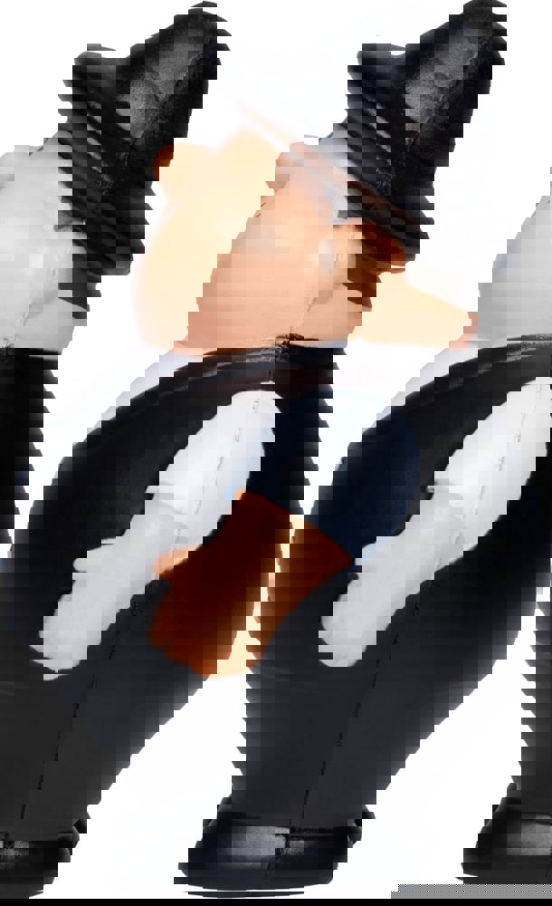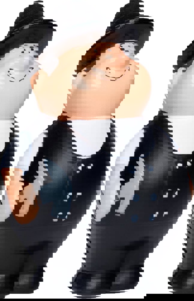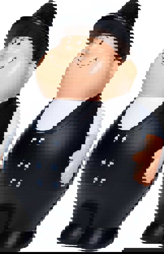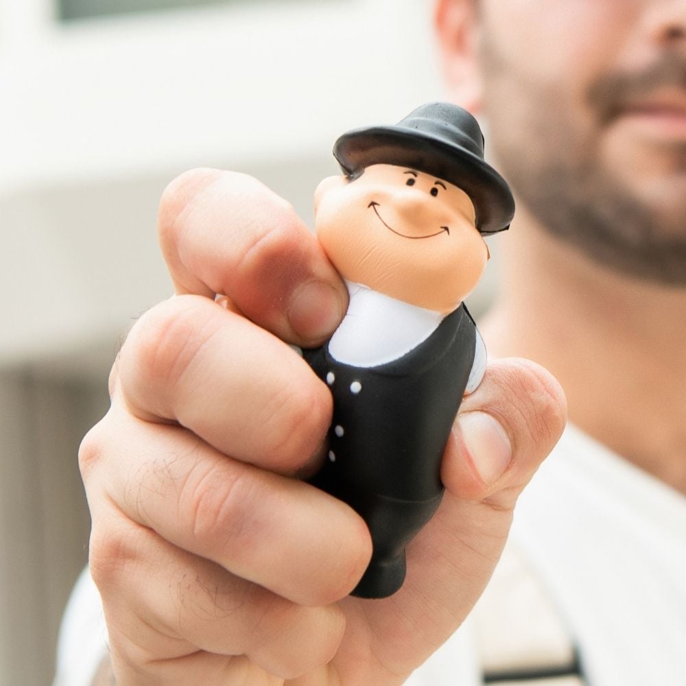 In traditional gaps, Bert® roofer provides professional stress control. A large black floppy hat with a wide brim is as much a part of it as the black trousers, the black shoes, the perennial (white collarless shirt) and the vest with white buttons. Of course, he also has tools to help you build something for your relaxation. He learned the working practices on the mill and the life experience he needed to relax, he also acquired during the years of his travels. To avoid stress: simply squeeze Roofer Bert® to reduce stress. Due to the material's properties, the product returns to its original shape.