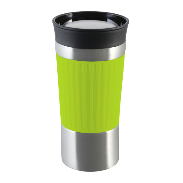 De hoogwaardige thermosbeker myKingston kan via de zachte siliconen sleeve aan het corporate design van de klant worden aangepast. De dubbelwandige thermosbeker met koperen vacuümisolatie is in een witte, zwarte of lichtgrijze poedercoating verkrijgbaar of in roestvrij staal met anti-fingerprintcoating. U kunt kiezen uit 18 verschillende siliconenkleuren. De thermosbeker houdt dranken tot 6u warm en tot 24u koud.
