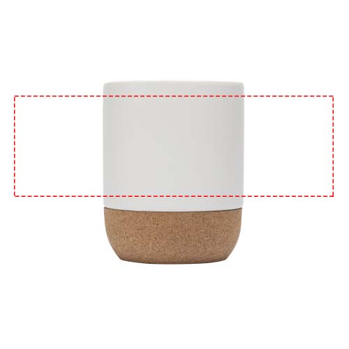 Keramiek mok met kurkdetail aan de onderkant en een speciale coating aan de buitenkant die sublimatiebedrukking mogelijk maakt. Glanzend wit aan de binnen- en buitenkant. Met de hand wassen met warm water en een mild schoonmaakmiddel. Gepresenteerd in een gerecyclede kartonnen geschenkverpakking. Inhoud: 300 ml.