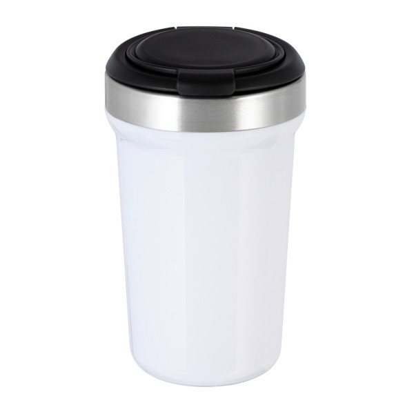 Onze eigen innovatieve ontwikkeling herdefinieert het principe van de herbruikbare beker voor promotionele boodschappen. De beker van 350 ml bestaat uit drie componenten: de binnenbeker is gemaakt van hoogwaardig roestvrij staal, waarop een wit of zwart deksel met een uniek groot drukoppervlak kan worden geplaatst. Om het concept compleet te maken, kunt u voor de buitenbeker uit twaalf kleuren kiezen - tien transparante en twee effen bekerkleuren.