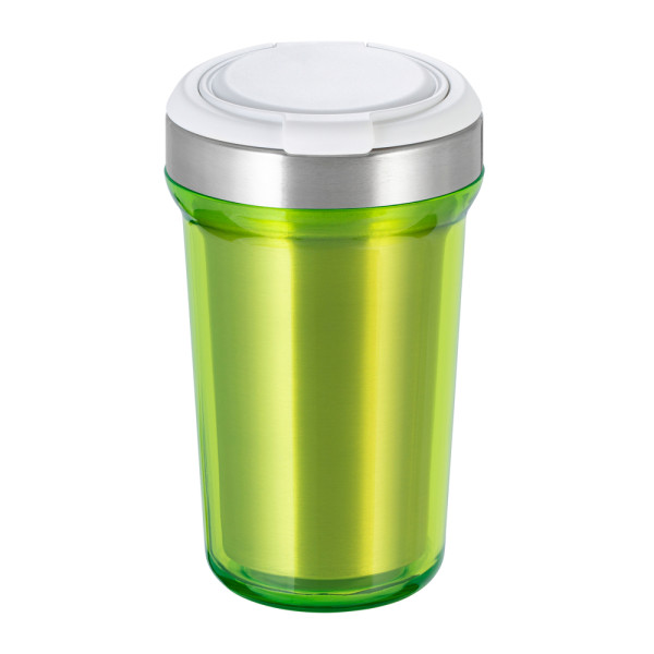 Onze eigen innovatieve ontwikkeling herdefinieert het principe van de herbruikbare beker voor promotionele boodschappen. De beker van 350 ml bestaat uit drie componenten: de binnenbeker is gemaakt van hoogwaardig roestvrij staal, waarop een wit of zwart deksel met een uniek groot drukoppervlak kan worden geplaatst. Om het concept compleet te maken, kunt u voor de buitenbeker uit twaalf kleuren kiezen - tien transparante en twee effen bekerkleuren.