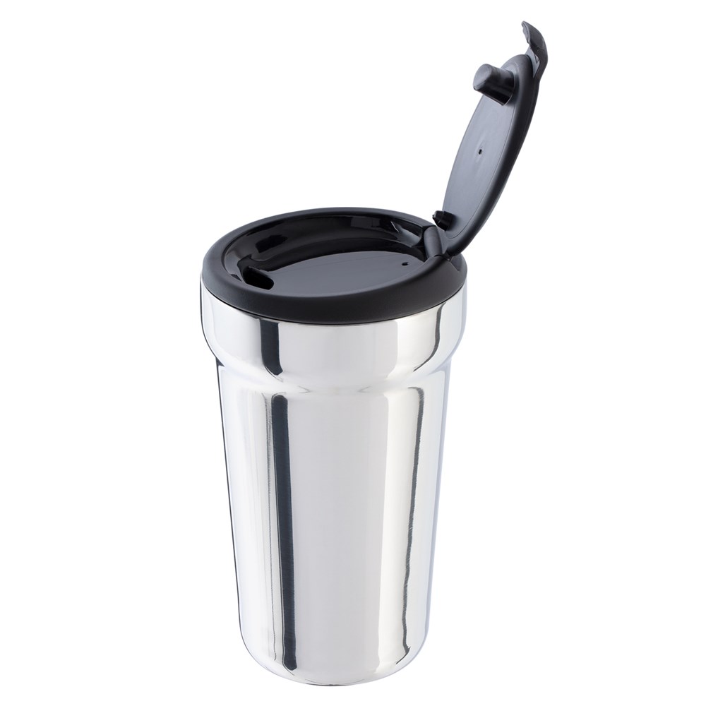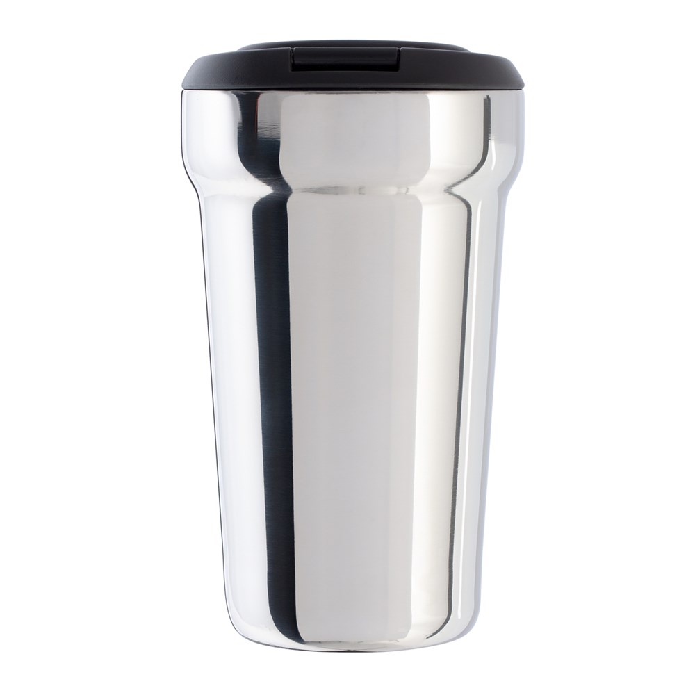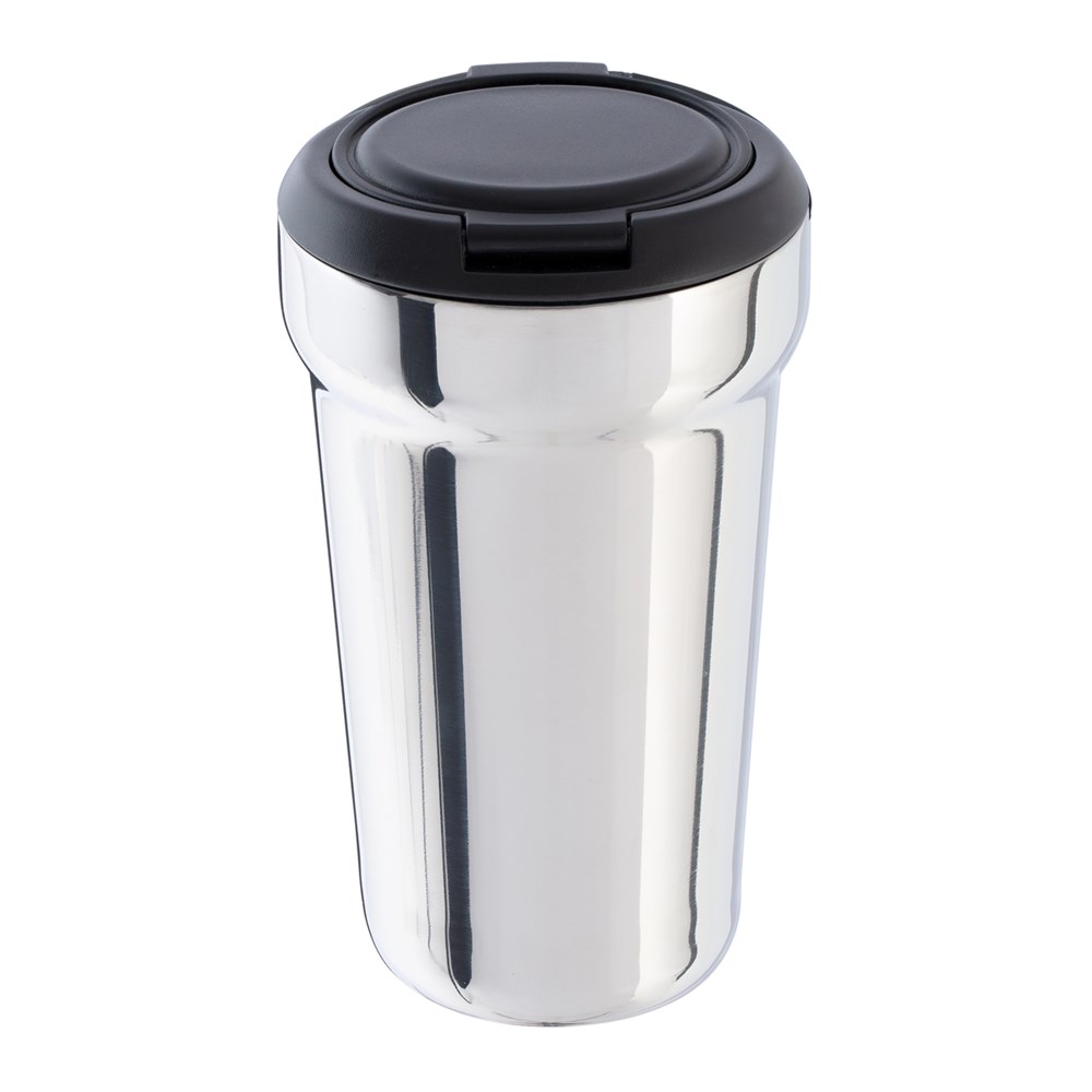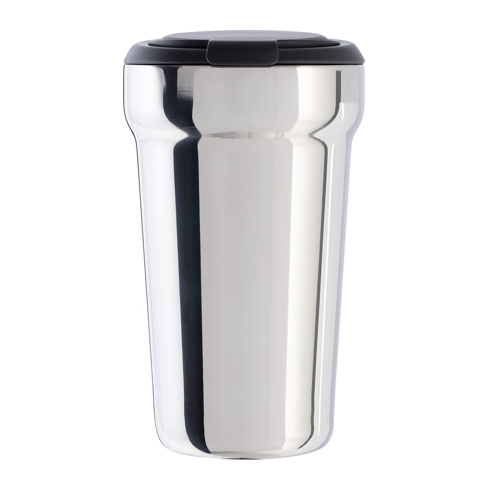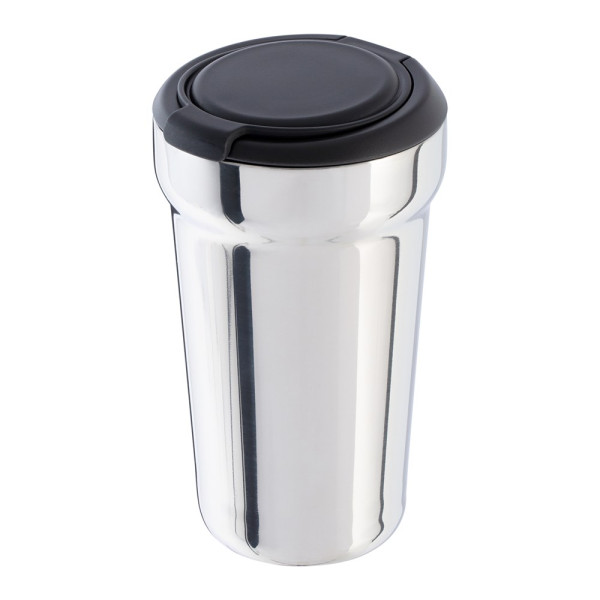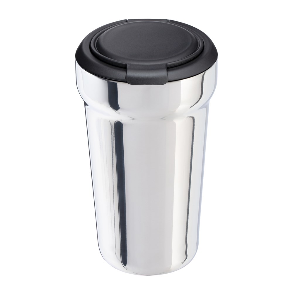 Met RETUMBLER-VIVERO STEEL, een eigen REFLECTS® ontwerp, overhandigt u uw klanten een thermobeker met een grote inhoud van 350 ml en een uitstekende functionaliteit. De beker van gerecycled roestvrij staal is verkrijgbaar in drie versies: met zwarte poedercoating, witte poedercoating en hoogglans zilverkleurig. De poedercoating geeft de thermobeker een moderne, matte uitstraling en een goede krasbestendigheid. De speciale afwerking met hoogglans zorgt voor een absoluut opvallende look van de beker. De deksel is verkrijgbaar in zwart.