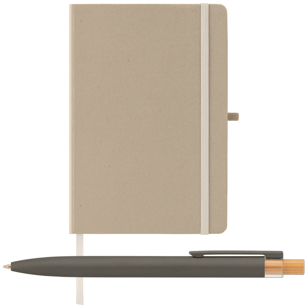 The Terra Recycled Milk Carton Hard Cover A5 Notebook & Reborn Pen Set features a unique cover made from recycled milk cartons, giving it a distinctive, textured look with dots due to the recycled material. It includes 80 sheets (160 pages) of smooth, 70gsm Ivory paper sourced via responsible forestry, perfect for capturing notes or ideas. Bound in a classic book style, the notebook features a matching elastic strap closure, secured with a silver rivet on the back cover, and a coordinating satin ribbon bookmark for easy navigation. This notebook is paired with the Reborn recycled aluminium pen, which includes a bamboo plunger, stainless steel clip, rPET plastic contour. The pen is offered in Gunmetal for all notebook colors.