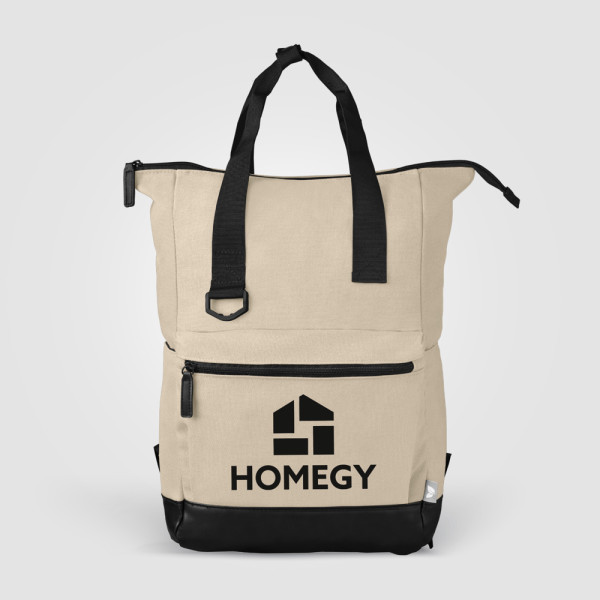 The Odyssey Pack Recycled Cotton Canvas Tote Bag is a versatile solution for modern life. Made from 16 oz. recycled cotton canvas with rPET 210D lining. It has a spacious main compartment with a zip and a padded sleeve that fits laptops including 13" (33 cm), 14" (35.6 cm), 15" (38.1 cm), 16" (40.6 cm), and 17" (43.2 cm). It also features a front zip pocket, padded shoulder straps, a recycled PU bottom, and a closure strap on the upper handles. The bag includes a QR code for a Digital Product Passport.