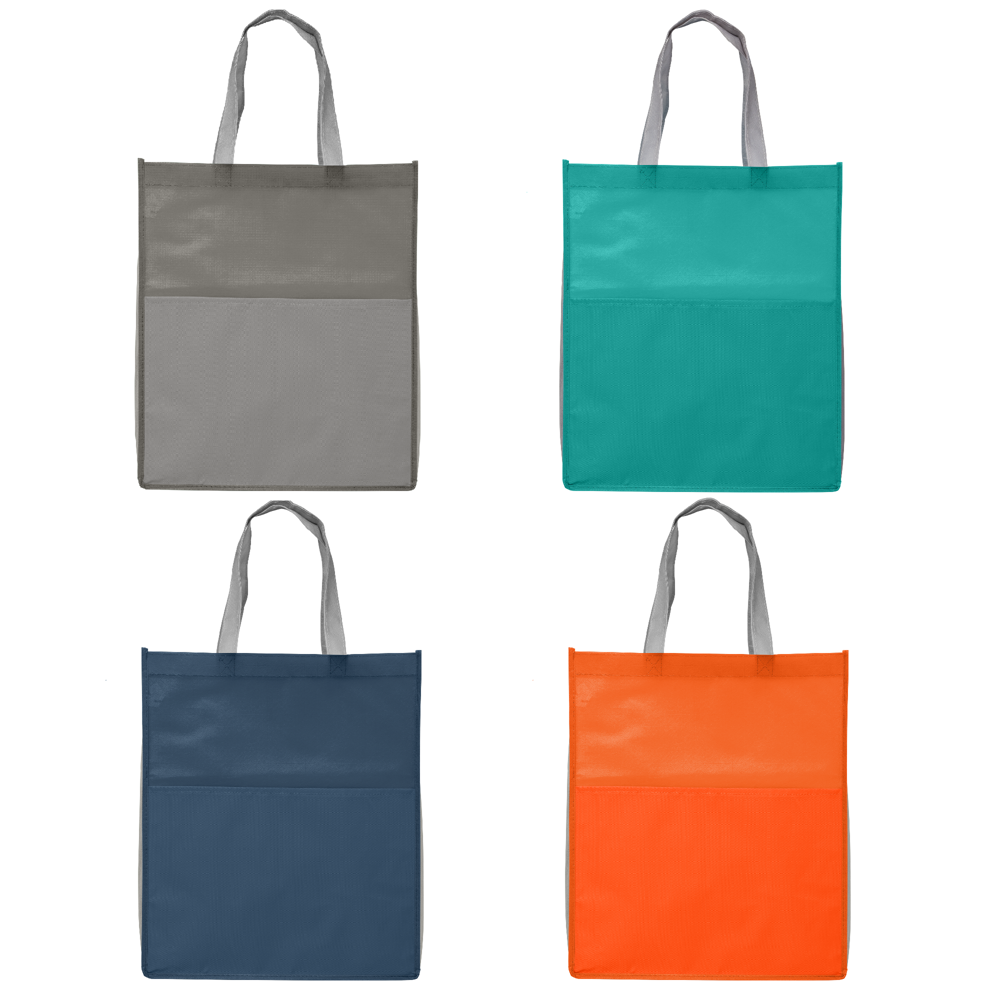 The Rome - Non-Woven rPET Tote Bag made with recycled plastic water bottles. This is a great way for businesses to share their brand in a sustainable way. It features eye-catching colour options with gray side panels and handles. The large front pocket is great for holding phones, keys, and more, making this a convenient shopper tote. Customize with your 1-colour silkscreen logo.