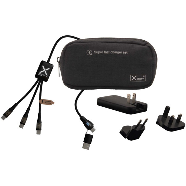 Deze compacte en draagbare oplaadset bevat een GaN-adapter van 65 W met PD-technologie en verwisselbare contactdozen (VS/EU/VK), een 5-in-1 60 W snellaadkabel van gerecycled rPET en een opbergtasje van gerecycled materiaal. Perfect voor het opladen van meerdere apparaten, waaronder computers, tablets en smartphones, en het zorgt voor supersnel en efficiënt opladen onderweg. Kabellengte: 1 meter.
