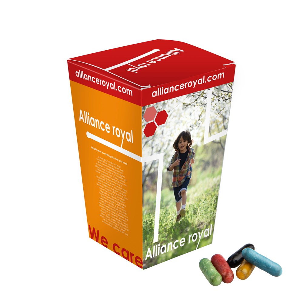 Full colour bedrukt doosje voor in de autobekerhouder, gevuld met ca. 250 gram Dropstaafjes