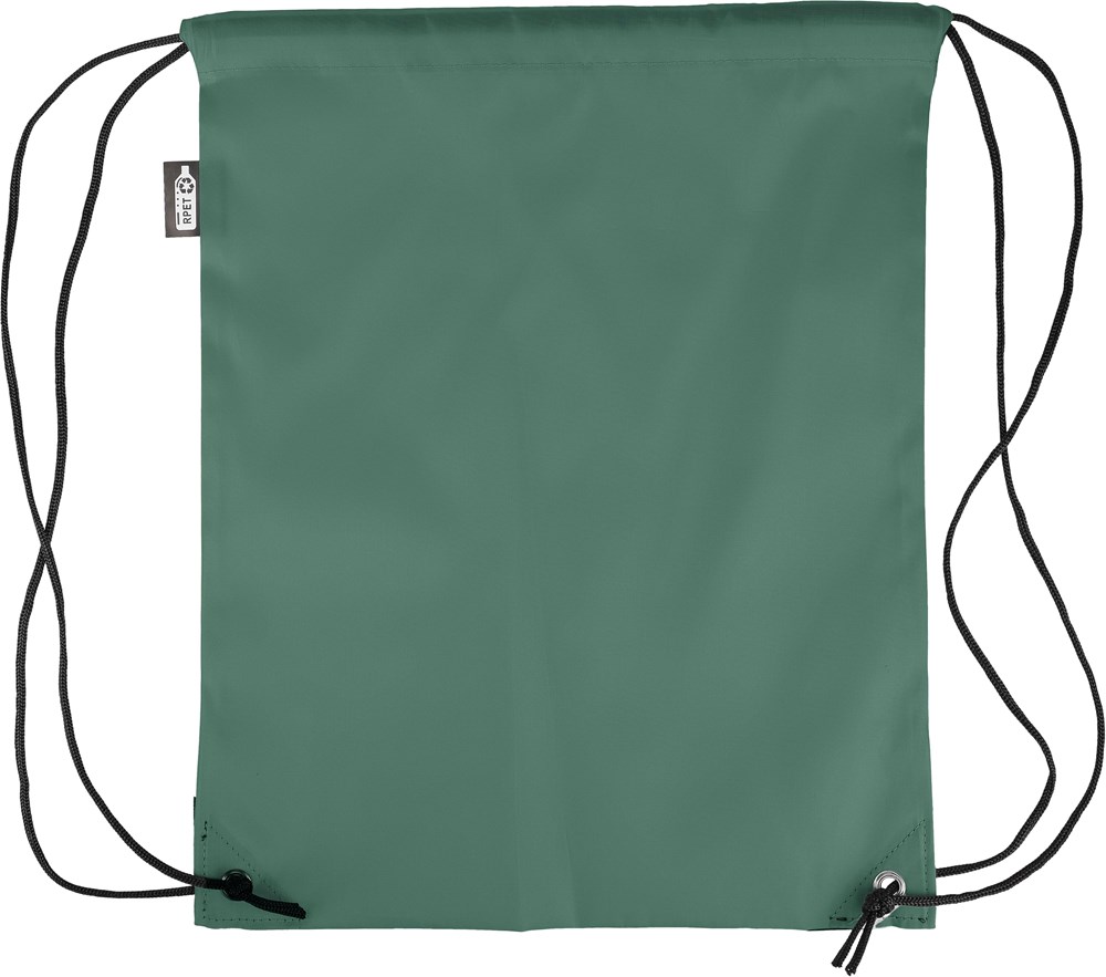 rPET polyester (210D) trekkoord rugtas met twee zwarte PU-hoeken aan de voorkant en met stiksels aan de binnenkant. Voorzien van een zwarte nylon koord aan elke zijde, een trekkoordsluiting. Capaciteit: 5 L. Draagvermogen: 7 kg. Inclusief rPET-label.