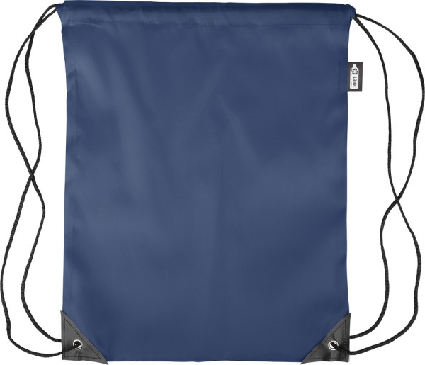 rPET polyester (210D) trekkoord rugtas met twee zwarte PU-hoeken aan de voorkant en met stiksels aan de binnenkant. Voorzien van een zwarte nylon koord aan elke zijde, een trekkoordsluiting. Capaciteit: 5 L. Draagvermogen: 7 kg. Inclusief rPET-label.