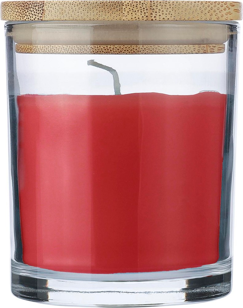 Glazen kaars met 120 gram gekleurde was en een vanillegeur, in een transparante glazen houder met bamboedeksel. Heeft ongeveer 20 branduren. Per stuk verpakt in een witte kartonnen koker.