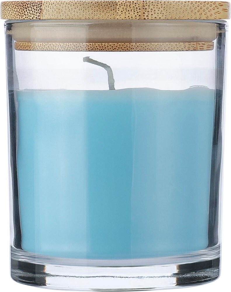 Glazen kaars met 120 gram gekleurde was en een vanillegeur, in een transparante glazen houder met bamboedeksel. Heeft ongeveer 20 branduren. Per stuk verpakt in een witte kartonnen koker.