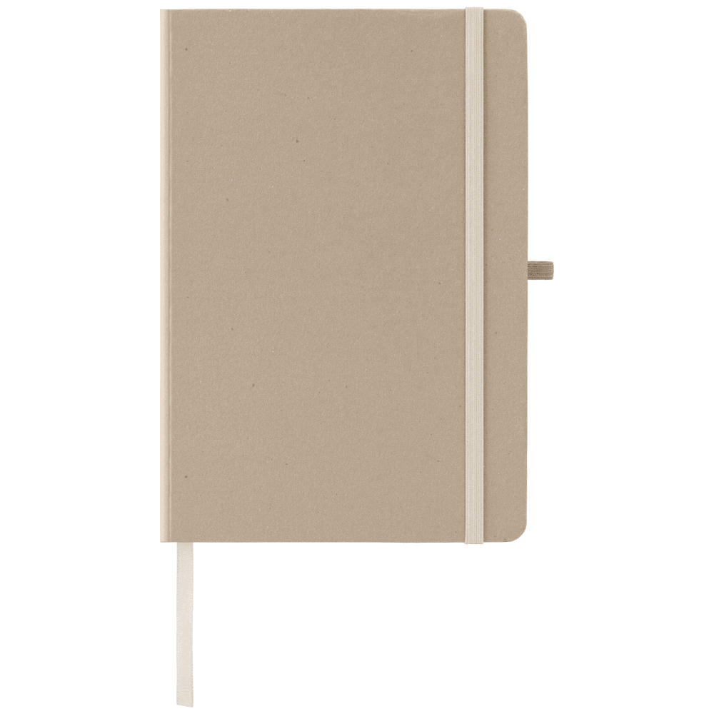 The Terra Recycled Milk Carton Hard Cover Notebook - A5 offers a unique cover made from 31% recycled milk cartons, giving it a distinctive, textured look with dots due to the recycled material. It includes 80 sheets (160 pages) of smooth, 70gsm Ivory paper sourced via responsible forestry, perfect for capturing notes or ideas. Bound in a classic book style, the notebook features a matching elastic strap closure, secured with a silver rivet on the back cover, and a coordinating satin ribbon bookmark for easy navigation.