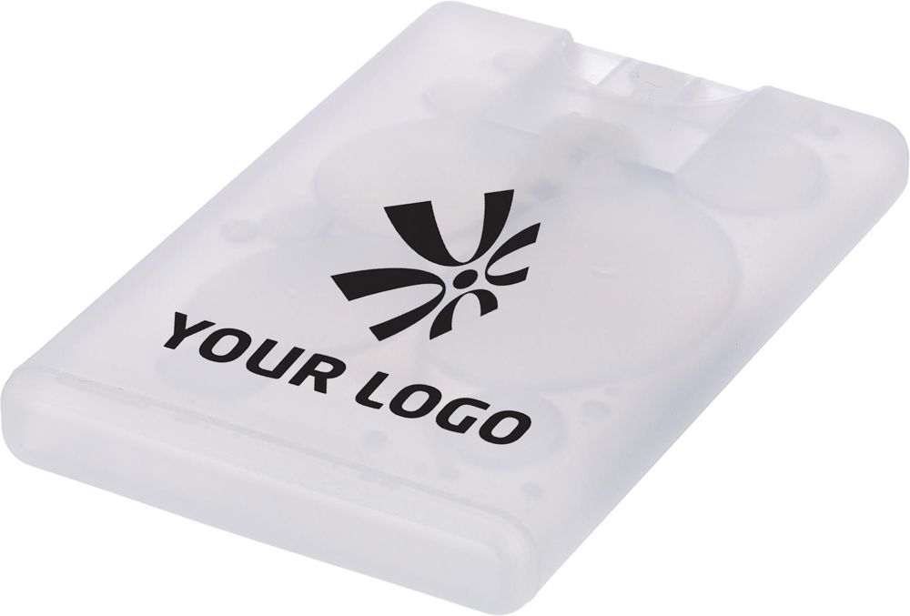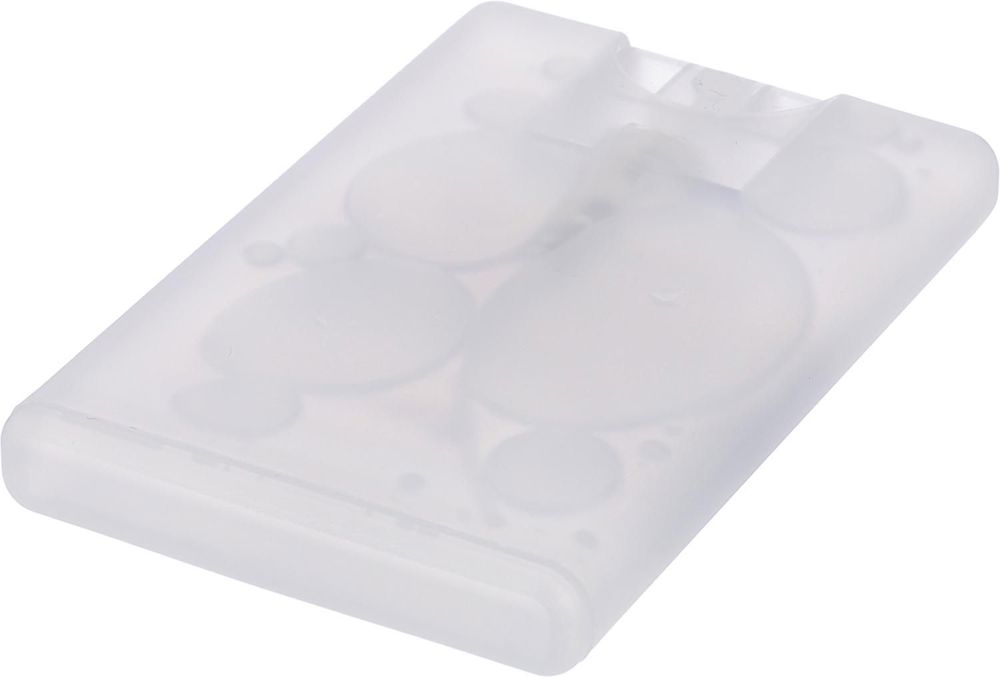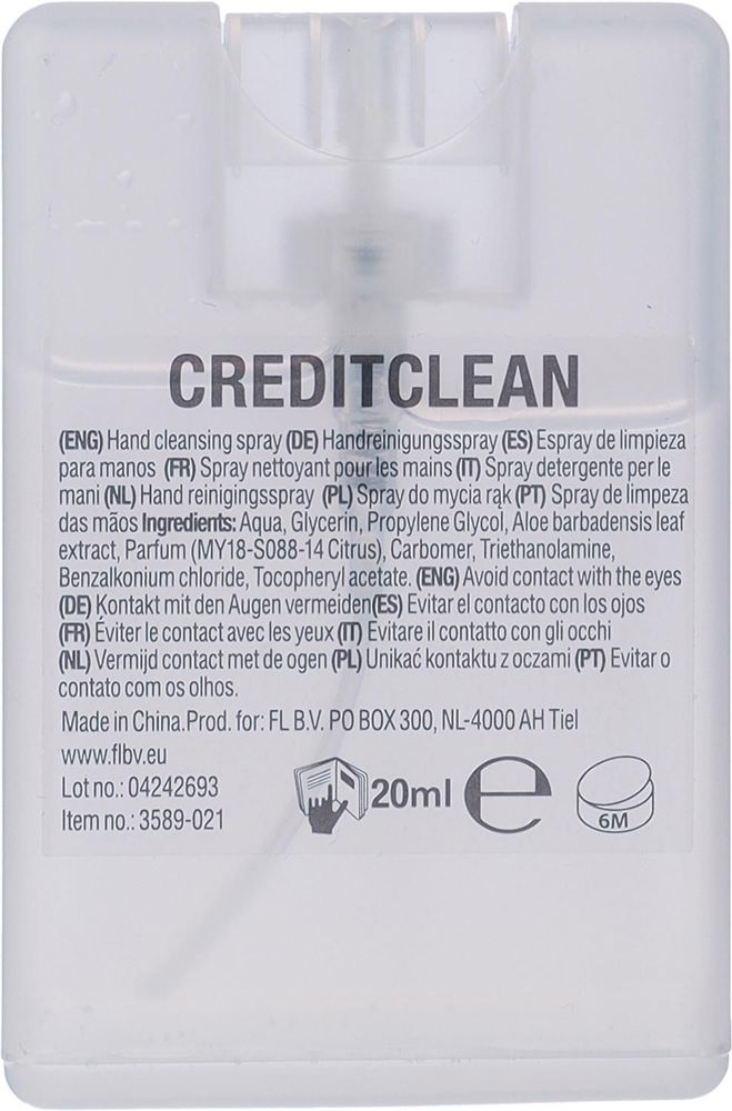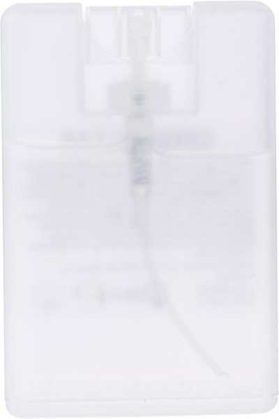 Handspray in creditcardvormige kunststof houder (20 ml), ethanolvrij.