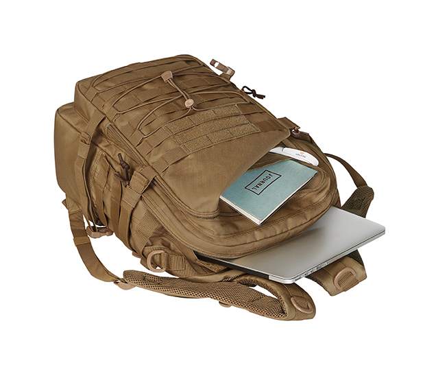 functionele rugzak met 3-zijdig Molle-bandsysteem en klittenband; elastische koord; groot hoofdvak met onopvallende 2-wegritssluiting; gewatteerd notebook-vak met klittenbandklep; uitgang voor kabel of drinkslang; groot gaasvak met rits; voorvak met 2-wegritssluiting en organizer-vakken; compressieriem met gespen; ook afsluitbaar aan de voor- en achterkant, bijv. om vast te maken aan trolleygreep; rechts en links D-ringen; gewatteerd rugdraagsysteem met in de hoogte verstelbare borstriem; D-ring en riemlussen op de draagbanden, in de lengte verstelbare heupgordel, handgreep