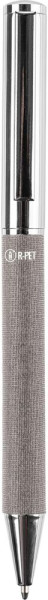Messing en rPET draaibalpen met metalen clip en grip. Voorzien van draaimechanisme en rPET-logo op het lichaam. Individueel verpakt in een bruine kartonnen doos. Blauwe inkt.