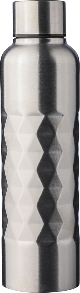 Gerecycled roestvrijstalen enkelwandige drinkfles (800 ml) van roestvrij staal 304. Voorzien van een diamantvormige structuur op de fles, schroefdop en lasergegraveerd gerecycled logo. Individueel verpakt in een bruine kartonnen doos.