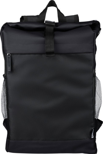 rPET (600D) polyester rolsluiting rugzak met waterafstotende PU-coating. Voorzien van een verborgen voorvak met ritssluiting, gevoerd laptopvak (geschikt voor laptops t/m 15 inch), mesh zijvakken en in totaal vijf compartimenten, inclusief binnen- en voorvakken. Ontworpen met verstelbare schouderbanden en een oprolbare sluiting met klittenband. Capaciteit: 25 liter, draagvermogen: 15 kg. Inclusief een rPET-label aan de zijkant.