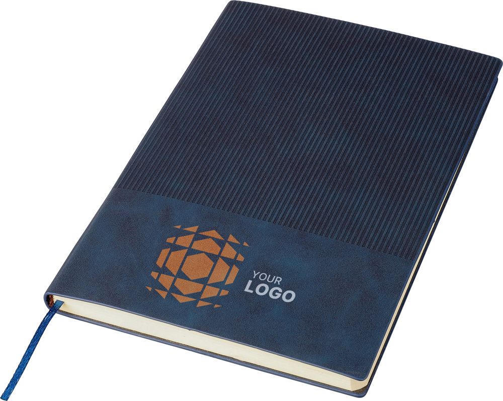 Gerecycled PU-notitieboek (ca. A5) met een harde kaft en ribfluweellook aan de bovenkant van de voor- en achterkant. Inclusief lintbladwijzer en 100 gelinieerde pagina’s (80 gsm). Met een gerecycled logo in reliëf op de achterkant.