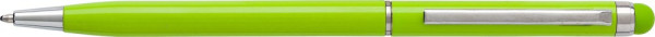 Elegante multifunctionele aluminium balpen, blauwschrijvend, met metalen clip. Door de rubberen top ook te gebruiken als capacitieve pen voor uw 'touch screen' schermen.