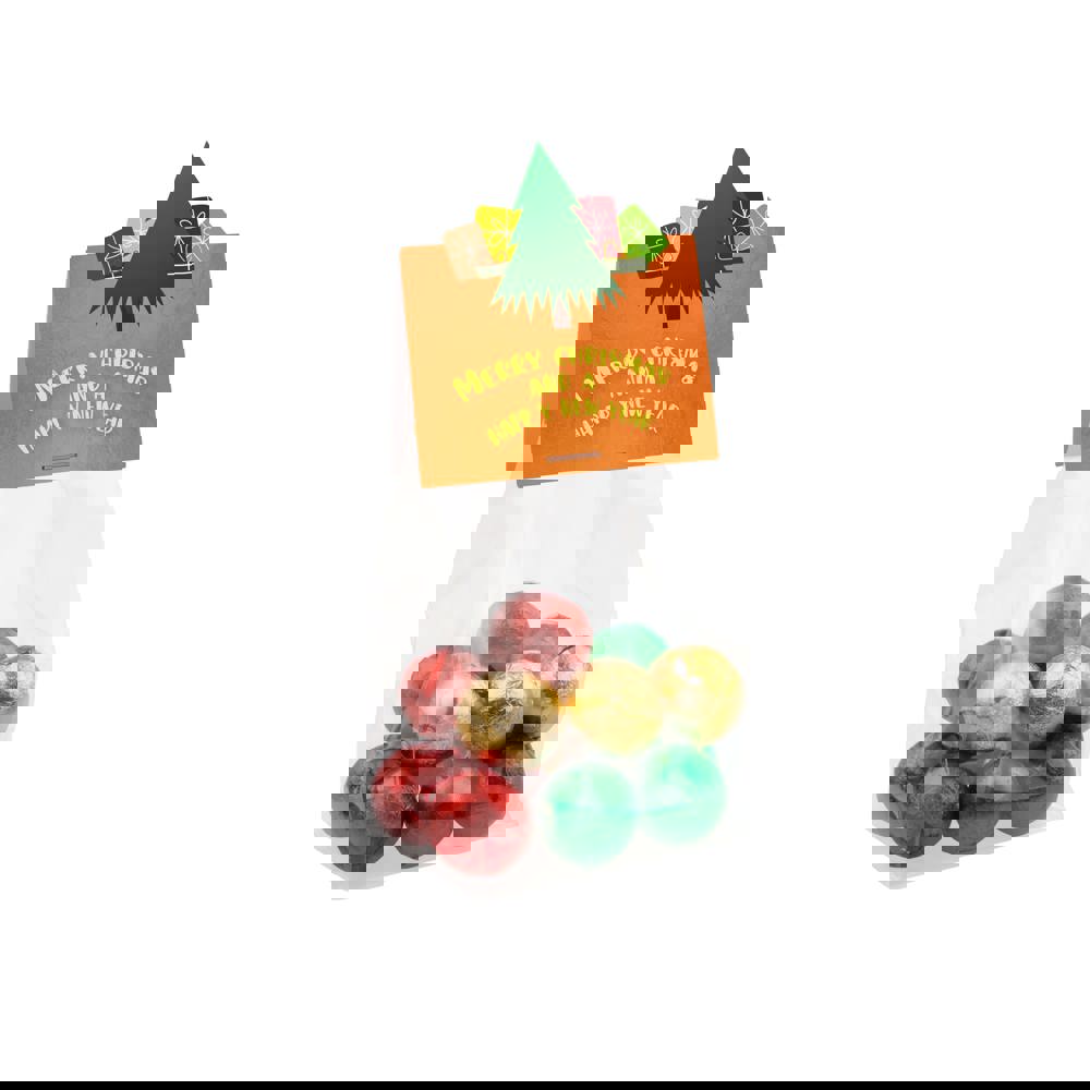 Transparant blokzakje met full colour bedrukt kopkaartje in eigen vorm, gevuld met 84 gram Kerstballen melkchocolade met melkcrèmevulling