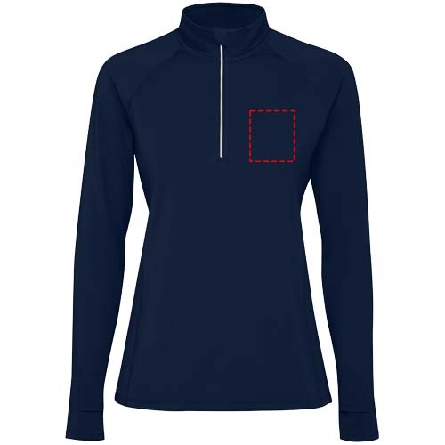 Technisch raglan sweater voor dames met lange mouwen. Slanke pasvorm. Kraag met een halve rits en een omgekeerd ontwerp met reflecterende details. Verstevigde naden. Manchetten met duimopeningen. Reflecterende details op de achterkant. De zoom aan de achterkant is iets langer dan aan de voorkant. Warme geborstelde binnenstof.