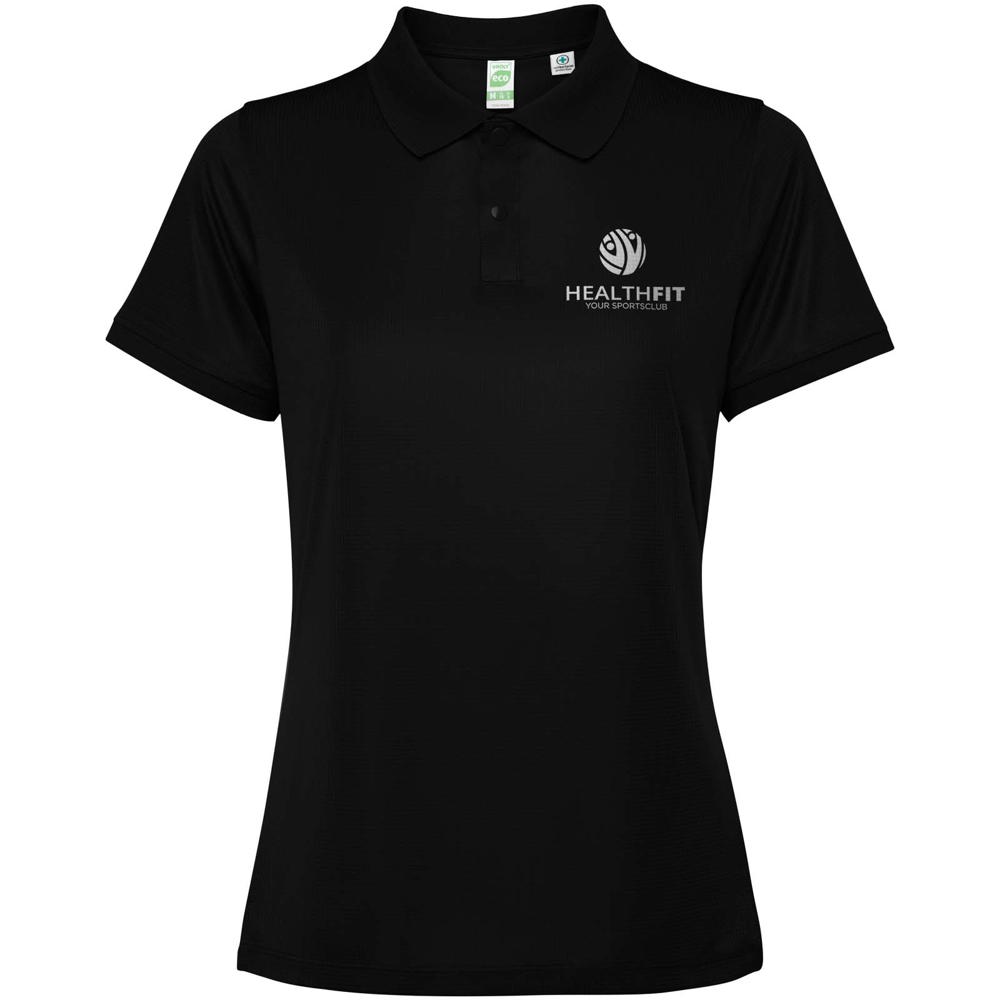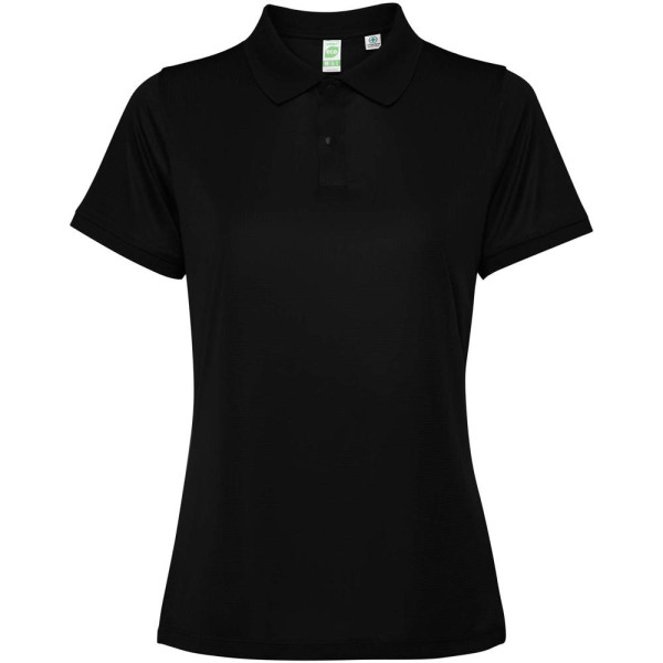 Getailleerde damespolo met korte mouwen. Versterkte bedekte naden in de binnenkraag. 1x1 geribde manchetten en kraag. Zijnaden. Knoopsluiting met 3 knopen en zijsplitten.