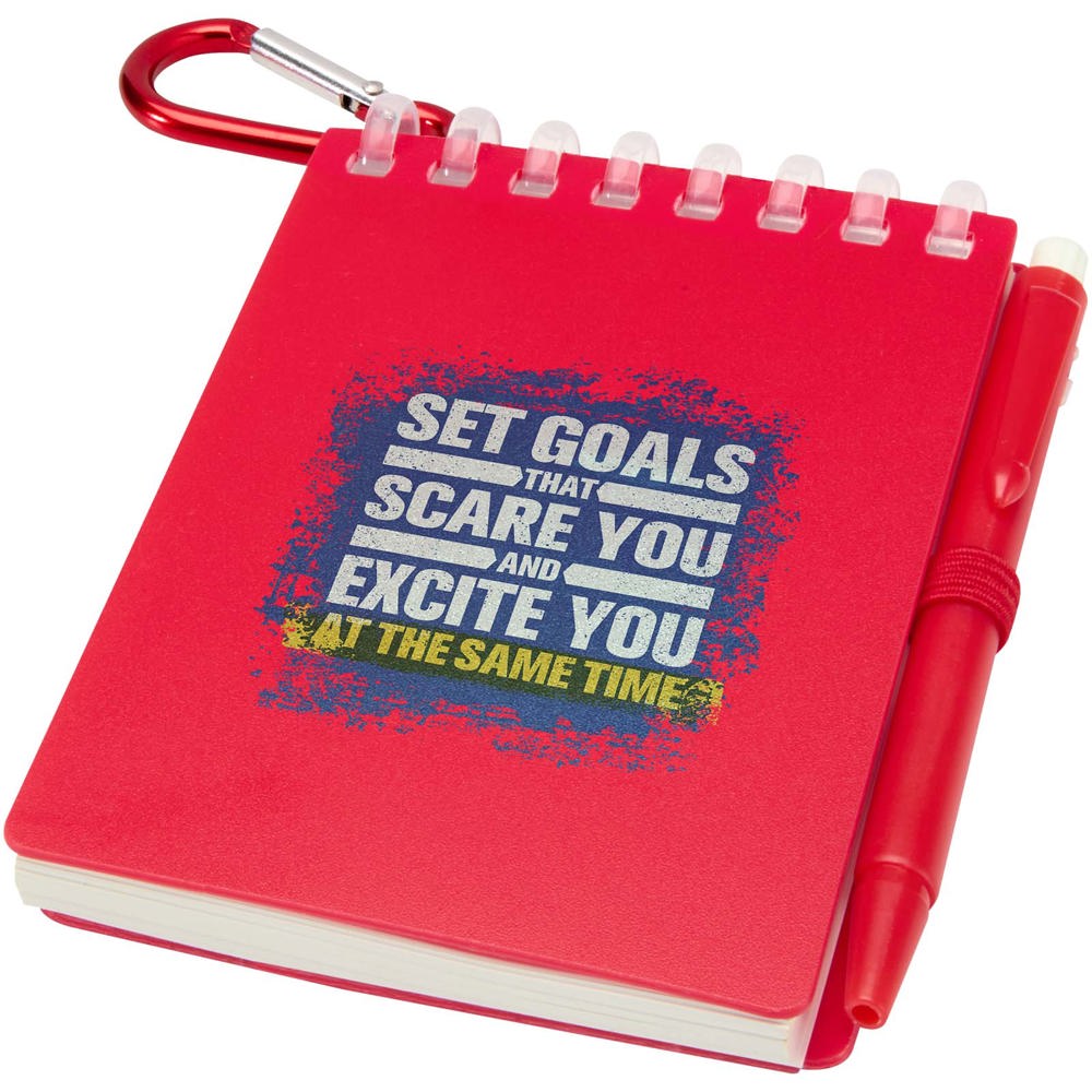 De Lig Mini notitieboek- en pennenset is een compacte, praktische metgezel voor onderweg. Het spiraalgebonden notitieboek heeft een zachte omslag van gerecycled plastic en bevat 70 blanco vellen van 120 g/m² waterbestendig steenpapier — ideaal voor gebruik buitenshuis. Met afgeronde hoeken en ingebouwde pennenlus combineert het de minitrend met functionaliteit. De bijpassende balpen is gemaakt van gerecycled ABS-plastic, schrijft in zwarte inkt en heeft een schrijflengte van 250 meter. Een kleurgecoördineerde metalen ring maakt het eenvoudig om de set aan een rugzak, tas of sleutelhanger te bevestigen — perfect voor duurzaam en draagbaar noteren. Formaat notitieboek: 11 × 7,5 cm.
